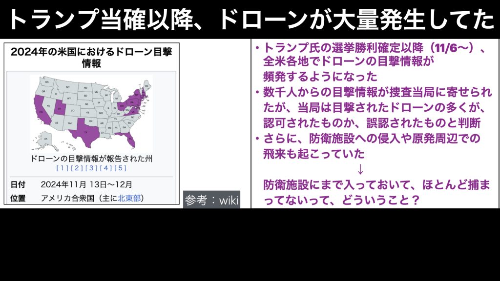 2024年11月の大統領選挙でトランプ氏が当選確定したのは、翌日の11/6だったと記憶していますが、それから約1週間後の11/13から12月にかけて、全米各地でドローンの目撃情報が一気に増加したのです。