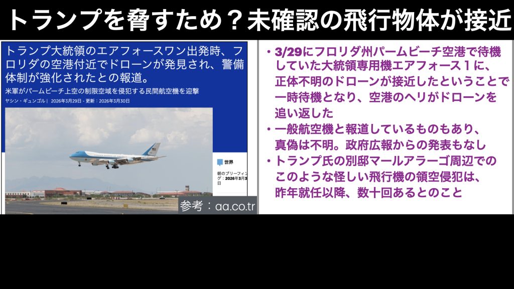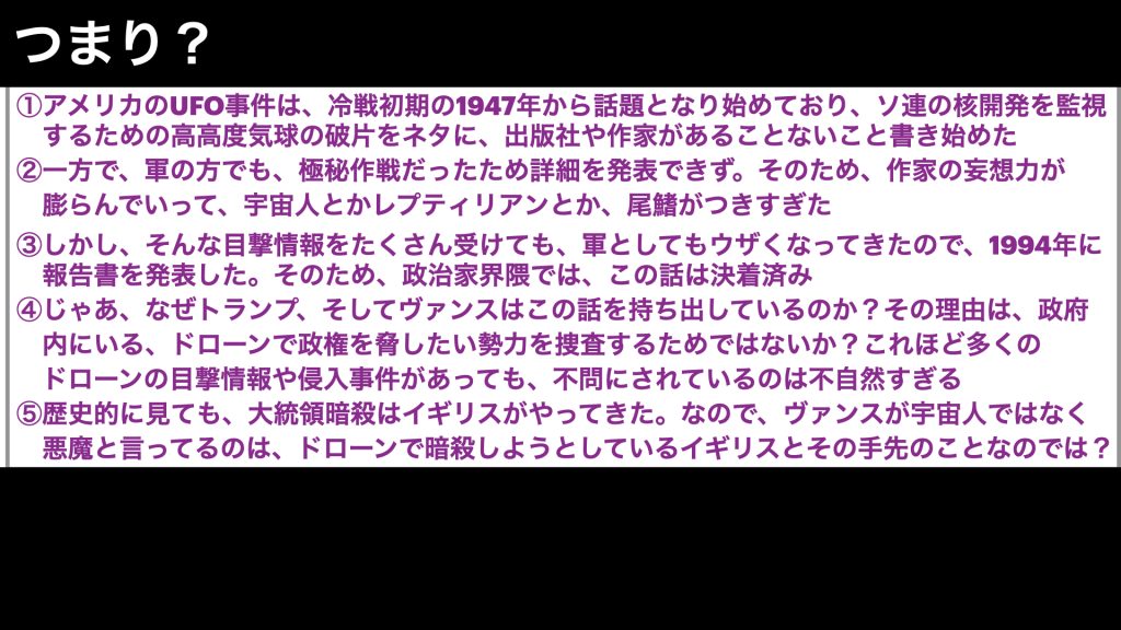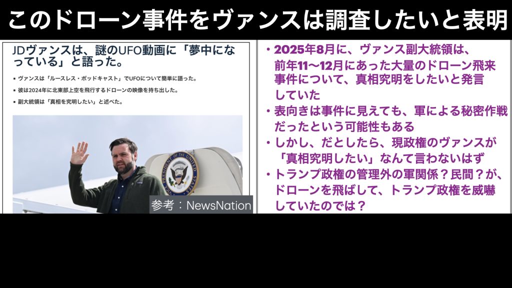 つまり、軍関係なのか、諜報機関なのか、民間やNGOなのかわかりませんが、そういうトランプ政権の管理外の組織が、ドローンを大量に飛ばして、威嚇していた可能性があるのです。