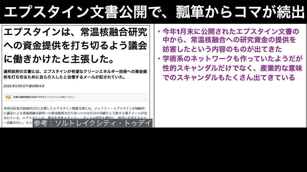 メディアが報道する以外のネタも、ネット上で多くの人が分析して、主にX上で公開されています。その中には、性的なスキャンダルだけでなく、アメリカの研究者が発見してきた画期的技術の開発を妨害したなんて話も出てきており、なかなか面白い展開になっています。